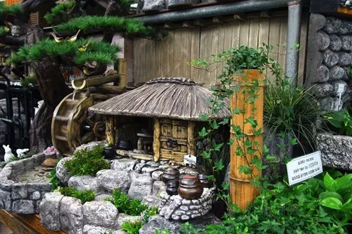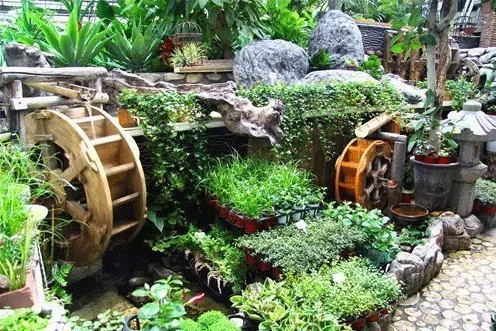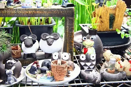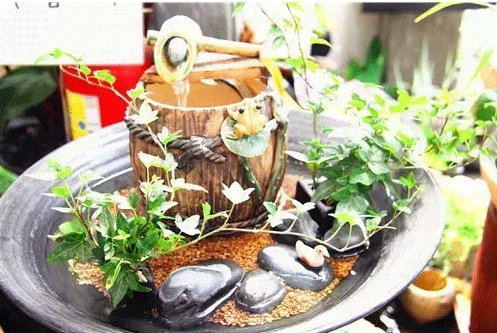 市場(chǎng)內(nèi)銷售水生植物的攤位制作的小水景