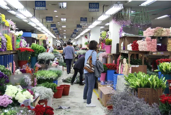 鮮花市場(chǎng)靠近盆花銷售區(qū),面積不大,每天23:00至次日13:00營(yíng)業(yè),入駐了100家左右商戶。切花以月季、百合、康乃馨、菊花等為主,都使用小格子存放花材,效果美觀。不過(guò)韓國(guó)最大的鮮切花市場(chǎng)位于漢城高速公路客運(yùn)站旁。