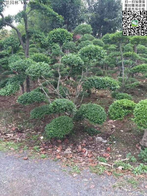 小葉女貞造型樹,經(jīng)過人工整形及修剪成形,形態(tài)各異,多為多球形或云片型,高1.2米至3米,叢生或獨干,每株可存有幾個至十幾個球(或云片)。它葉小、常綠,且耐修剪,生長迅速,盆栽可制成大、中、小型盆景。極易成活,樹條柔嫩易扎定型,極富自然野趣。