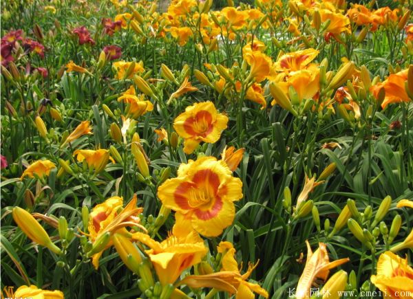 萱草,樹體高0.5~2米高左右,樹葉形狀根據(jù)種類不相同有差異,有一些很細(xì)很長,有一些比較圓,萱草花蕾顏色是增加,如國旗紅,粉紅色,鵝黃黃,粉白色等,開花的時間比較長,花量十分大,每年的是開花的季節(jié)時間段從6月上旬到8月,花種9~10月才熟,有較好的出苗水平。